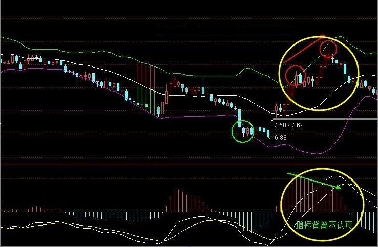 第三种:当价格运行在布林线中轨和下轨之间的区域时,只要价格不冲破中轨的话,那么就说明了市场处于空头行情,当然此时的交易策略就是逢高点进行卖出了,此时不应该考虑买进。