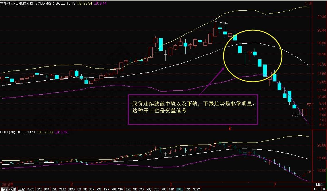 当然有开口就有收口,一般来说,如果股价在跌破布林指标的平均线的时候就为卖出讯号,带状区处于水平方向移动,而股价连续穿越“下限”,预示股价弱势,未来有较大的下跌可能,如下面的丰乐种业(老案例了)。