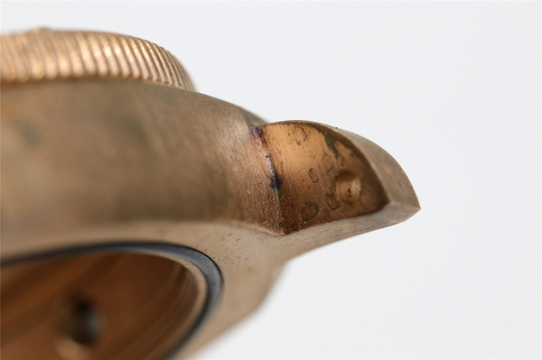 外圈处理精细,牙口也表耳打磨十分到位,在照片中可以看到表面黑色的纹路和印记就是青铜暴露在室温下的氧化痕迹,这种痕迹随着时间的流逝会越来越均匀,所以,382的魅力在于越戴越美,在没有任何辅助正常佩戴的情况下,半年它将达到最完美的状态,类似古玩手串那种包浆效果。