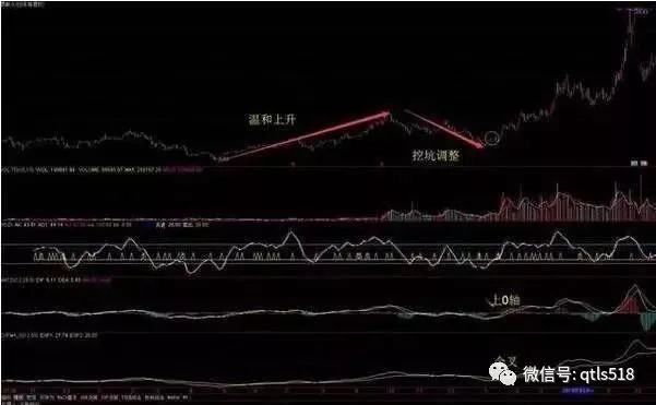另外一种K线主升浪出现在回头挖坑之后,再次大幅拉起。出现的几率还比较大,主升之后走势更加奇诡,主要原因是深度洗盘之后主力操盘比较轻,随心所欲。