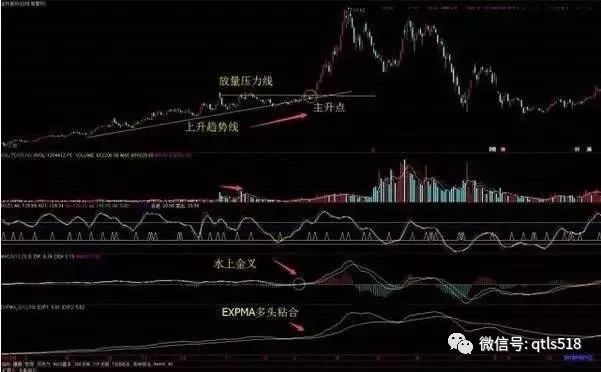 常 见主升的平台突破为上升三角,股价缓步上升,量能温和放大,当突破前期放量压力位置的时候,也就是上升趋势线和压力线相交叉的时候,出现主升浪的概率增 大。同时间其他技术指标必须走好,如MACD至少要在0轴之上,或形成金叉,EXPMA应该是金叉或者是多头粘合的位置。注意,突破最好需要回踩的确认的 个股为佳。如下图。
