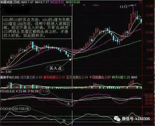 大家可以看下图的买入点位置,在买点出现之前,KDJ的J值为负数,CCI值在负200左右,此时不是介入的时机,当J线和CCI两线第一从负值去拐头向上是,才是切入的最好时机。
