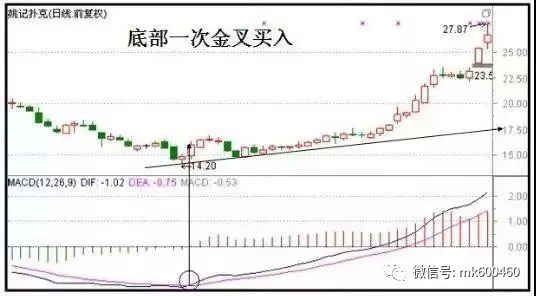 经过一波调整之后,在零轴下出现一次金叉,金叉之后向上行,所以一次金叉是买点。但强度会比二次金叉差点,如果继续上行,不产生二次金叉,可以加仓。