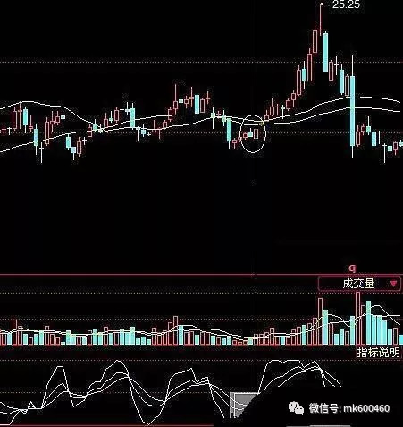 案例一:美欣达(002034)这只股票的日K线图,我们看图中被我用黄色方框圈起来的KDJ指标,当天,也就是2011年2月25日,该股的KDJ指标出现“从下向上三线金叉”。