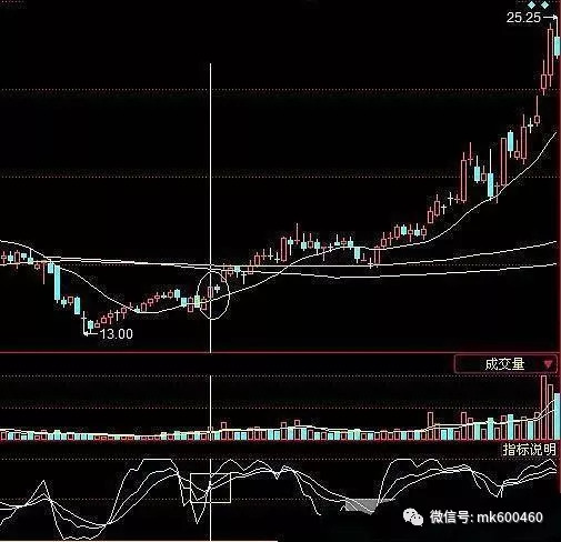看下美欣达(002034)这只个股的周K线图,我们看上图是002034美欣达这只个股的周K线图,图中我用黄色方框圈起来的地方,出现了KDJ指标“从下向上三线金叉”,大家看当天的日期是2011年2月25日。核心机密被大家看出来了,该股日K线KDJ指标三线金叉的日期和周KDJ指标三线金叉的日子是同一天。这一天闭上眼睛买入股票,后市股价大家看,上涨了109%。