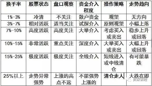 一般来讲,换手率较高的股票,往往也是短线资金追逐的对象,投机性较强,股价起伏较大,风险也相对较大。以下是一个日换手率的参考数据表: