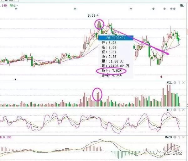3、相对高位成交量突然放大,主力派发的意愿是很明显的,然而,在高位放出量来也不是容易的事儿,一般伴随有一些利好出台时,才会放出成交量,主力才能顺利完成派发,这种例子是很多的。