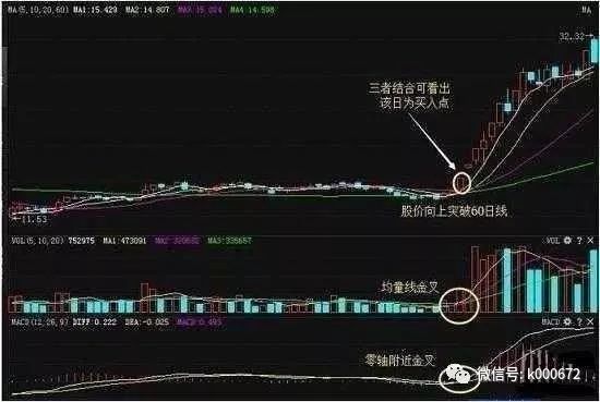 当股价上涨趋势已经形成,零轴附近的金叉预示着调整行情已经结束,新一轮上涨行情即将开始。此时如果还伴随着均量线的金叉,就说明股价的上涨得到成交量的支持,买入信号将更加可靠。