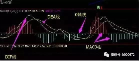 MACD指标由DIF线、DEA线、MACD柱线和零轴这“三线一轴”组成,其中DIF线是12日EMA线(快速移动平均值)与26日EMA线(慢速移动平均值)的差值,而DEA线则是DIF线的9日EMA值。