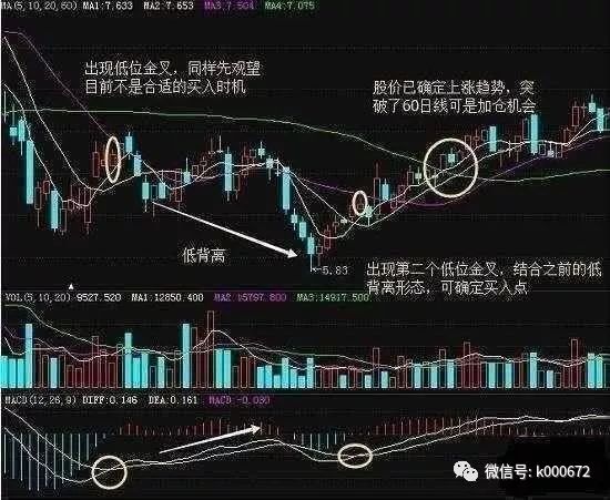 2,MACD指标上两条线,白线上穿黄线叫金叉:MACD线在0轴之下潜水金叉不急着做,因为时间长而涨幅小,且有可能继续下跌才好做成底背离。。。卡位0轴的金叉最好,又稳健又确定性上扬。。。飞天金叉不好把握,飞天金叉之后或者是急速上涨一轮或者是立刻见顶。