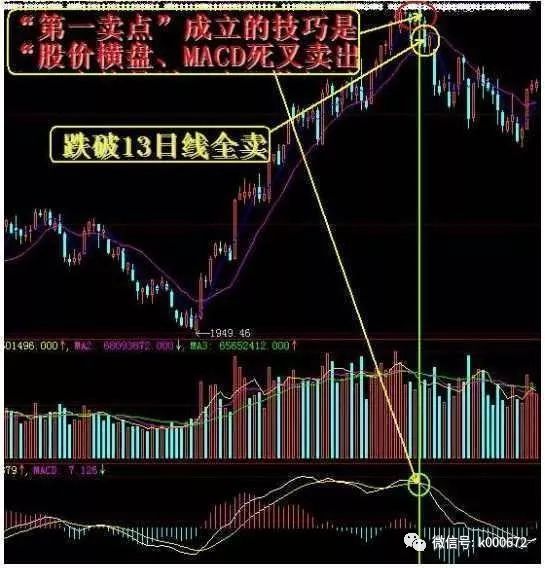 其含义是指股价在经过大幅拉升后出现横盘,从而形成的一个相对高点,投资者尤其是资金量较大的投资者,必须在第一卖点出货,或减仓。判断“第一卖点”成立的技巧是“股价横盘、MACD死叉卖出”,也就是说,当股价经过连续的上涨出现横盘时,5日、10日移动平均线尚未形成死叉,但MACD率先死叉,死叉之日便是“第一卖点”形成之时,应该卖出或减仓。