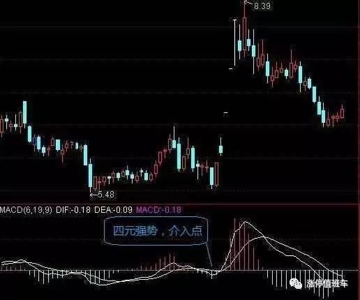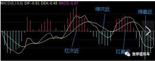 最近的红柱比次近的红柱面积大,而最近的绿柱比次近的绿柱面积小,这4个元素显示最近K线强势(四元强势)。