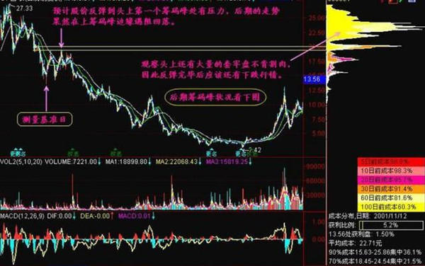 因此,要使筹码峰从高位转移到下面,需要两个条件,第一要有一定的下跌时间;第二要有一定的下跌空间。必须跌出时间、空间。