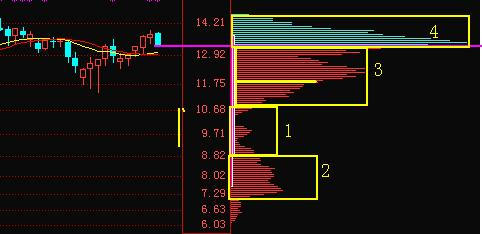 3、直观看出不同位置的价格和持仓份额,(由下往上)看到最低持仓成本与最高持仓成本,什么价格位置持仓的份额最多, 什么价格位置持仓的份额最少。