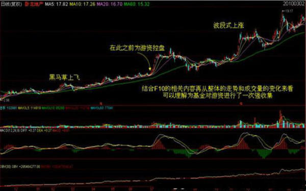 基金驱赶游资。当股票的基本面出现明显利好时,基金会入驻这些股票,它们会利用各种手段使前期介入的游资交出筹码。最明显的示例是卧龙地产,该股票在 2009年半年报里依然有游资在驻守,到了三季报在十大流通股股东里基金占据了前八位。该股票也由前期的黑马草上飞走势变成波段式上涨。