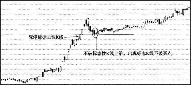一只股票如果出现了标志性K线,之后涨了上去,我们没有及时追进去,那么最好的办法就是等它回调时再行介入。回调的位置:一是标志性K线的上限,其次是标志性Κ线的上l/3位或者l/2位。我们这里只讲标志性K线的上限位置。
