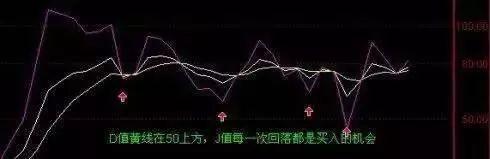 2、D值在50上方,J值回落买入: