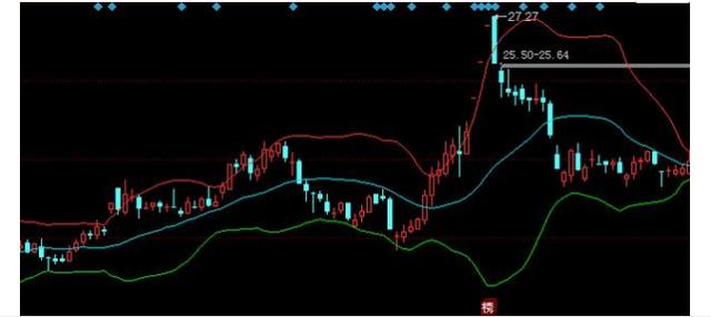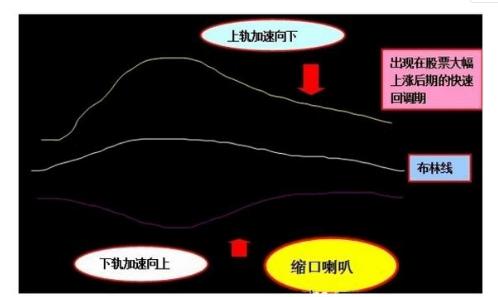 股价经过短期大幅拉升后,布林线下轨线和上轨线逐步扩张,上下轨的距离越来越大,随着成交量的逐步减少,股价在高位出现急速下跌的行情,这时的布林线的上轨开始急速掉头向下,而下轨线还在加速上升。这就是缩口喇叭。
