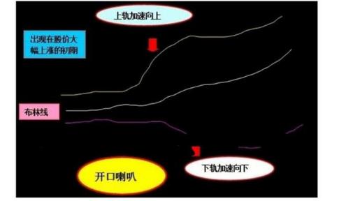 股价经过长期下跌整理后,布林线的上轨线和下轨线逐步收缩,上下轨之间的距离越来越下,随着量能地逐步放大,股价突然向上出现急速飙升的运行情况,此时布林线上轨线也同时急速向上扬升,而下轨线却加速向下运行,这样整个布林线的上下轨线之间的形状就形成了一个类似于大喇叭的特殊形态,这就是开口喇叭。