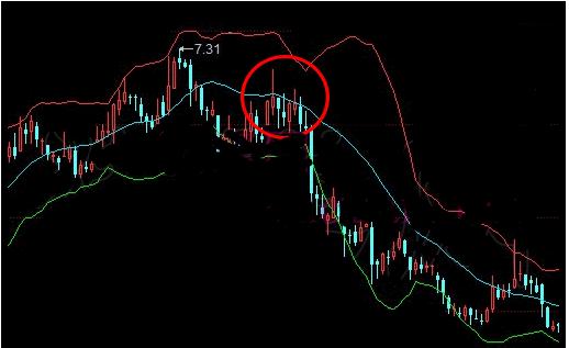 5.当美国线从布林线的上方、向下突破布林线上轨后,如果布林线的上、中、下轨线的运动方向也开始同时向下,预示着股价的短期强势行情即将结束,股价的短期走势不容乐观,投资者应以逢高减仓为主。