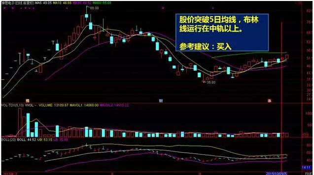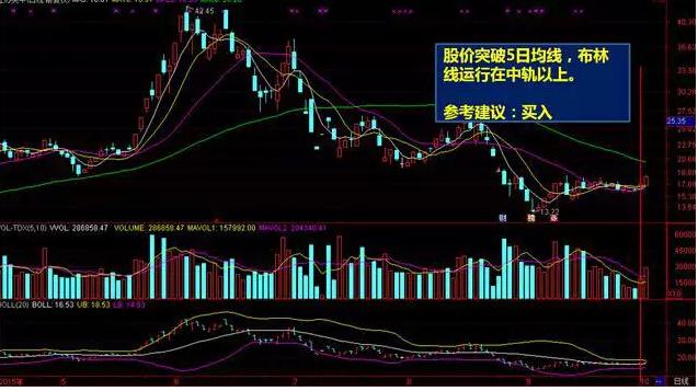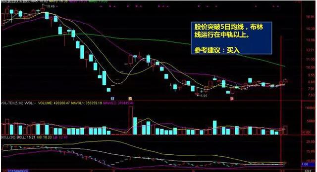 价格突破5日均线或运行在5日均线以上,同时布林线运行在中轨以上,买入。