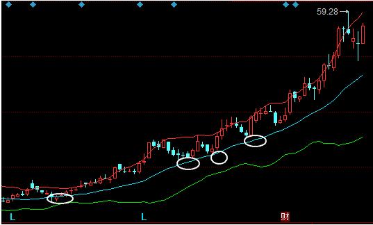 BOLL中轨本身是股价运行的移动平均。当股价下跌到BOLL指标的中轨位置获利支撑反弹时,说明股价正处于上涨行情中,并且未来会沿着BOLL中轨和上轨之间的通道持续上涨。这是一个买入信号。