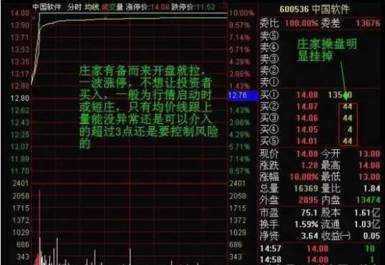 观察案例中的分时图走势变化,股价开盘就出现拉升,出现一波涨停,不想让投资者买入,一般在行情启动时,只要均价线跟上量能没有异常情况发生,就可介入。在股价上涨超过3个点之后,就要注意控制风险了。