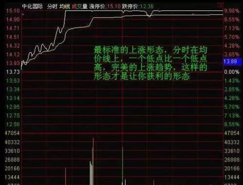 该案例就是标准的上涨形态,分时线始终在均价线上方运行,一个低点比一个低点高。这是完美的上涨趋势,这样的形态就是获利的操作形态,在股价低点位置。