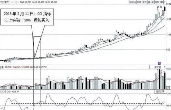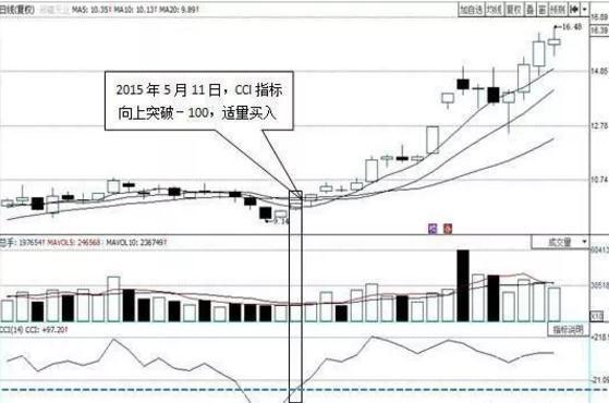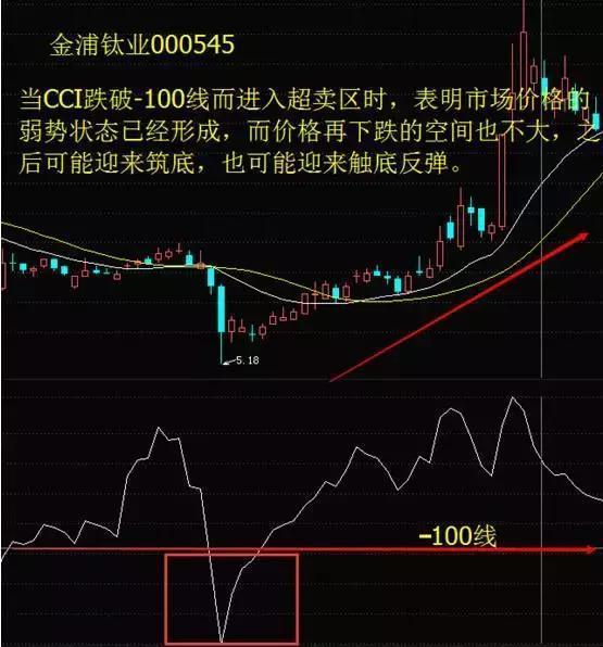 如果CCI指标本来在-100的超卖区运行,现在突破了-100线,开始上行,说明超卖区状态基本结束,K线开始反弹了,股价将上涨,投资者可以选择进场。