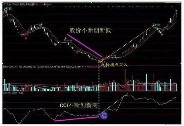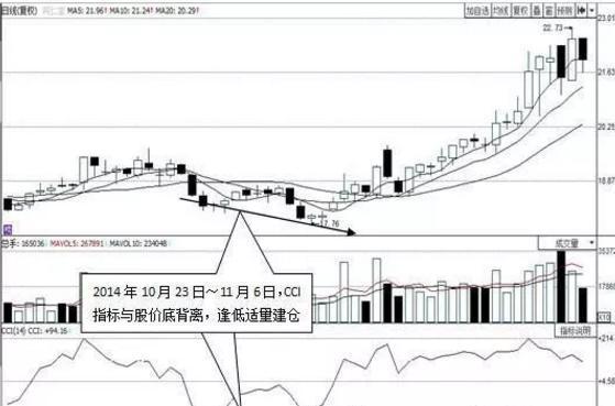 股价经过长期的下跌,一路不断创出新低,然而对应的CCI指标却拒绝继续下跌,反而不断上升,出现股价和CCI指标的背离。