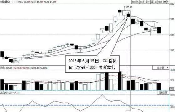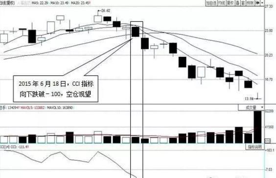 当CCI指标从上向下跌破+100线而重新进入常态区间,表明股价的上涨阶段可能结束,将进入盘整或下跌行情,投资者应及时逢高派发。