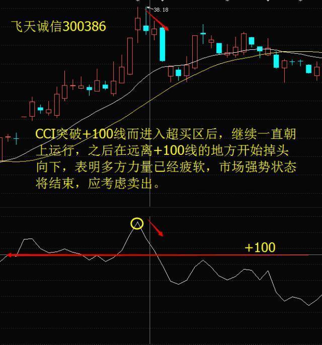 CCI突破+100线而进入超买区后,继续一直朝上运行,之后在远离+100线的地方开始掉头向下,表明多方力量已经疲软,市场强势状态将结束,应考虑卖出。
