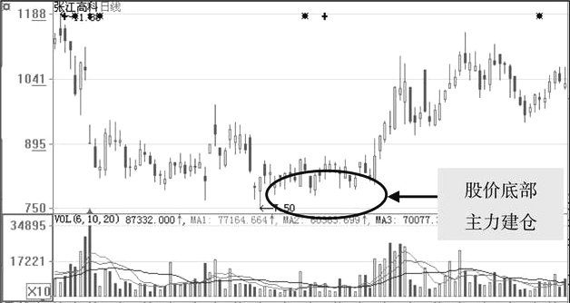 主力在建仓阶段有多种手法,这些手法虽然隐秘,但从价量观察上来看,应验了那句谚语“没有不透风的墙”。在股价极易被大资金操纵的情况下,成交量犹如中小投资者手中的一把利刃,只要能够对成交量的变化进行仔细的分析,就不难发现主力的真实意图。