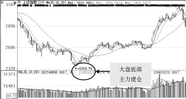大盘在长时间或者大幅度下跌之后,往往会出现一个大盘的底部。当大盘底部出现后其后市很可能出现反弹,甚至会出现报复性的大反弹。对于这样的赚钱机会,主力怎么能放过呢?但是抢反弹是有风险的,一招不慎,满盘皆输。在这个过程,主力可以凭借其信息、资金等方面的优势,降低风险程度,使抢反弹成为可控的交易。因此,经过谨慎判断之后,主力就会在大盘底部时建仓。