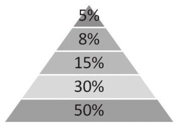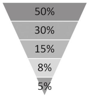 金字塔形仓位管理法即初始进场的资金量比较大,后市如果行情按相反方向运行,则不再加仓,如果方向一致,逐步加仓,加仓比例越来越小。仓位控制呈下方大,上方小的形态,像一个金字塔,所以叫金字塔形的仓位管理方法。