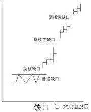缺口分普通缺口、突破缺口、持续性缺口与消耗性缺口等四种。从缺口发生的部位大小,可以预测走势的强弱,确定是突破,还是已到趋势之尽头,它是研判各种形态时最有力的辅助材料。