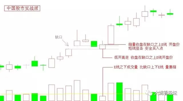5、庄家在去口之下低开故意制造恐慌在上攻、收盘并且站稳缺口之上K线开盘价、成交量比缺口上下K线萎缩、说明抛盘很少、面对如此抛盘、庄家用少量筹码即可拉升股价、庄家不拉是傻子;