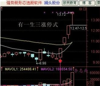 图五、有一生三涨停式:该图在前低位也曾出现过一次涨停,这是可遇不可求的一只同时具备两条件涨停潜力的典型。条件是:低位出现第一个涨停板的成交量和换手率同比前一日只增长1倍左右,超出2倍以上精确率将会降低。
