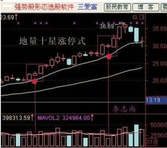 图二、地量十星涨停式:一般发生在一轮上涨趋势中,先是一根大阳或涨停,接着一根非常缩量的十星(无论阴阳),越是缩量也有把握在第三日再涨停或收大阳。