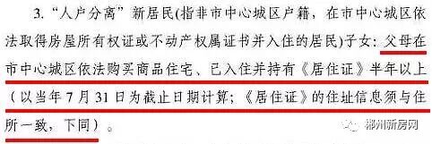 “人户分离”新居民子女的入学政策对入住时间提出了新要求,由过去的“父母在市中心城区依法购买商品住宅,并在当年7月31日前装修入住”、有“《居住证》或办证回执”,调整为“父母在市中心城区依法购买商品住宅、已入住并持有《居住证》半年以上(以当年7月31日为截止日期计算,《居住证》的住址信息须与住所一致)”。