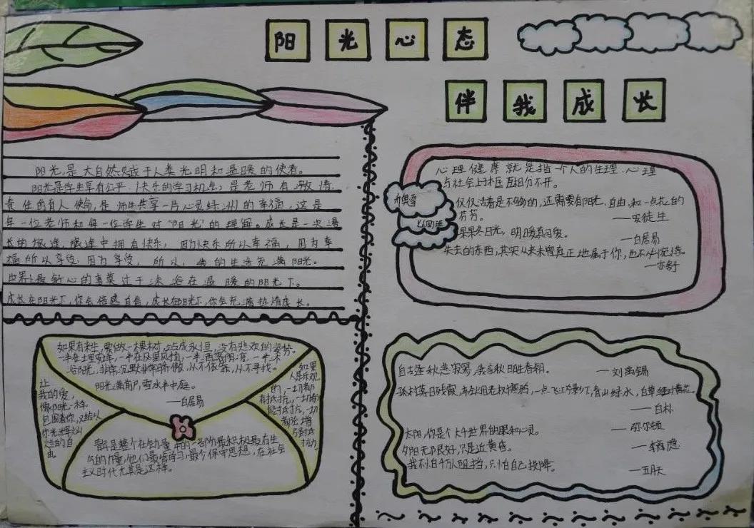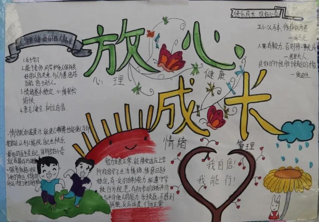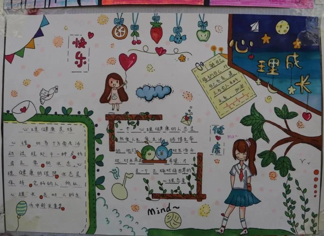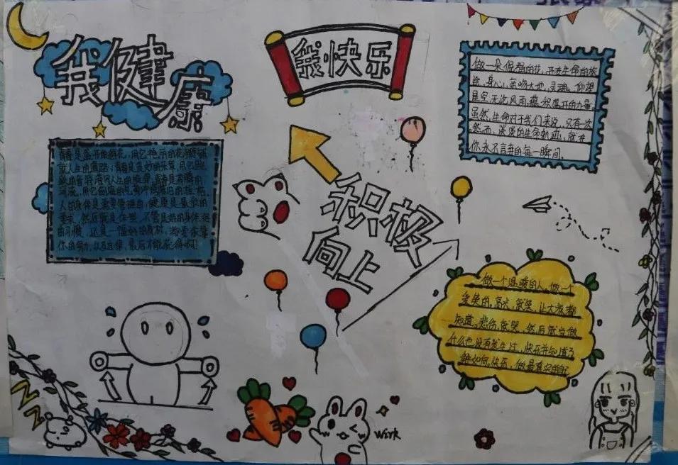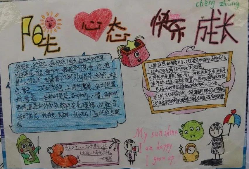 为了提高我校学生的心理健康水平,增强学生的心理保健意识,使校园内形成关注心理健康、懂得心理健康、重视心理健康的良好氛围,我校心理咨询室和心理健康教研组面向全校开展了以“我阳光、我快乐、我成长”为主题的心理健康手抄报比赛。