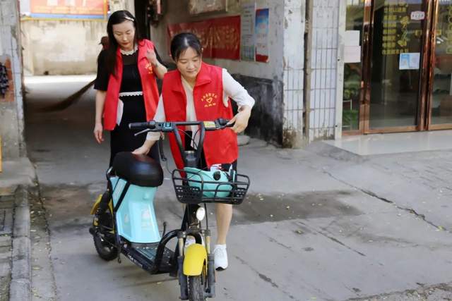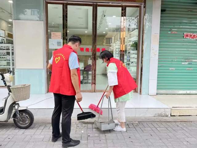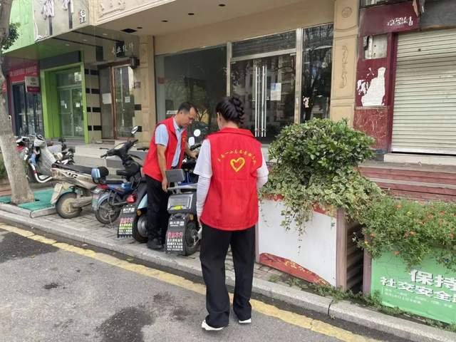 阜南县第一小学志愿者对道路上的不按要求停放的自行车、电动车进行重新摆放,同时对道路上的垃圾进行清扫。
