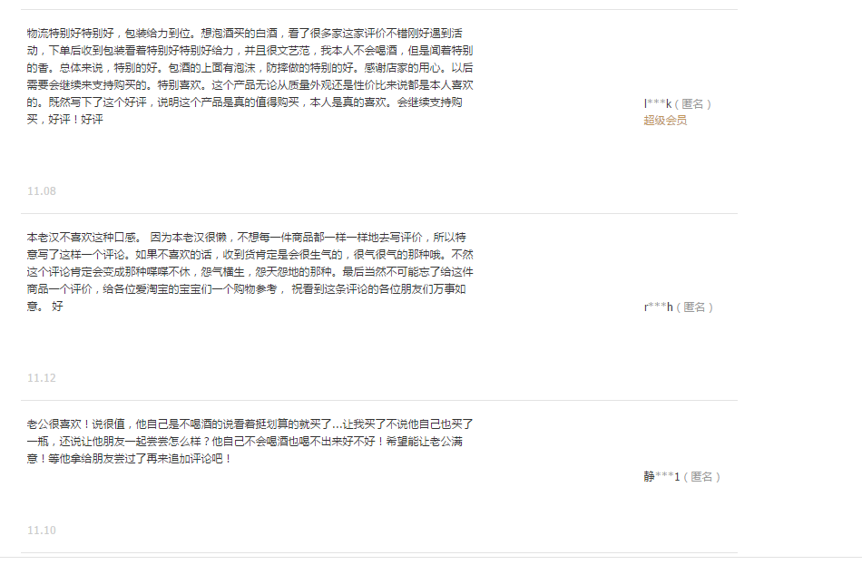 但这些店铺是成功的,成功的吸引了不少人购买,而真正懂酒人对酒的评价都是简洁凝练,字句很短的,那才是酒友的真实评价。所以大家网上买酒的时候尽量找简短而又具体从不同角度评价的评语看才能分析出店家卖的酒到底是不是好酒。(下图是某白酒在某宝上刷单留下的评价)