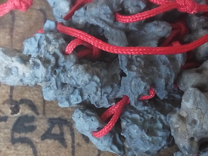 相传为当年莲师施法降魔时,从天空中降下的大片石雨,一度遍布桑耶寺附近的哈布日神山,以前寺里曾定期到山里收集然后流通,不过近些年可能由于采集过量已经越来越难以捡到。据说桑耶寺目前只用于装藏宝瓶和制作其他圣物,已经没有公开流通了。这是朋友自己到山上搜集到的。