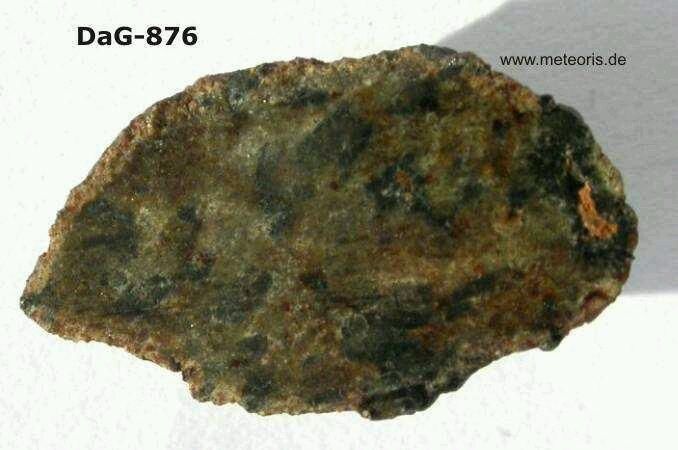 3、辉橄无球粒火星陨石:具糖粒状的细粒或粗粒结构,主要由堆积的绿色普通辉石晶体和少量细粒填充物质中的橄榄石组成,填隙物质由斜长石、碱性长石、铁钛氧化物、硫化物及磷酸盐构成,并见有角闪石、粘土矿物碳酸盐和硫酸盐等蚀变产物。