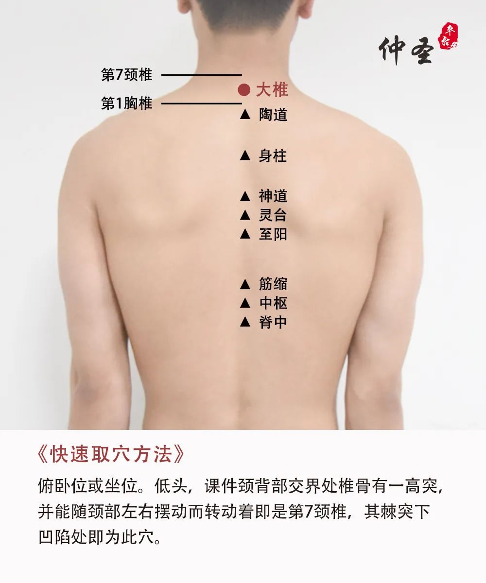 大椎穴为手足太阳经及督脉交会穴、为诸阳交会之所、统领周身之阳气。“督脉为病,脊强反折”,大凡脑病、癫痫所致抽搐为首选穴之一。