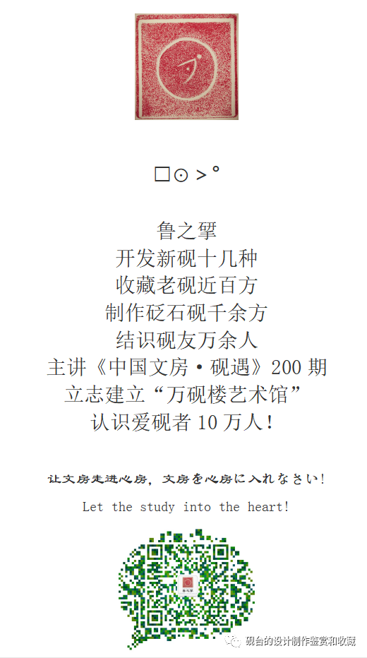 鲁之揅,文艺中年,手作匠人,文房器物收藏爱好者。曾以“王右中左”的笔名在公众号上创作“字体设计文章”,同时也是国民户外阅读运动发起人、“匠人读书公社”首任社长、旧石器研习所特邀观察员、砭石砚开创者、砭石文化研究者,倡导“天人合一不二”艺术理念。现居深山,读书、写字为生,作品多发在朋友圈(aidushuxuexi),敬请同好多多指教!
