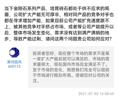这个回答其实很嚣张,你品,你细品,意思大概就是,你们都来生产金刚石也无所谓,都来扩产也无所谓,反正市场供不应求,这个蛋糕太大了,我随便吃,想怎么吃就怎么吃,横着吃,竖着吃,躺着吃都行。