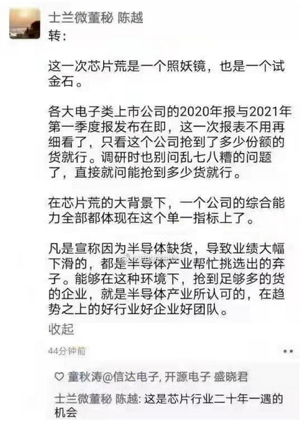 比这个董秘更嚣张的就是士兰微的董秘,两个月前他在朋友圈说:
