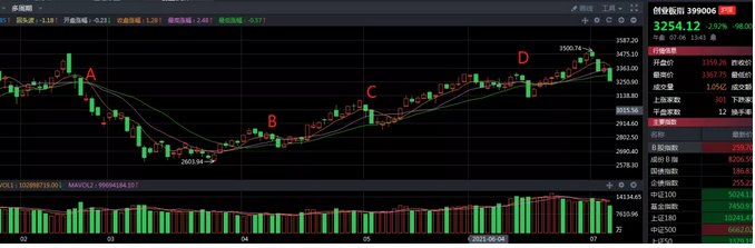 不过这个新高是有缺陷的,缺陷的点在于量没有跟上来,前天创业板大跌算是正常的调整,但是今日再次大跌,没有修复,这里从技术面看是有问题的。如图,创业板今年出现过ABCDE四次调整,BCD都是快速的修复,A点没有修复,开启了连续的调整。